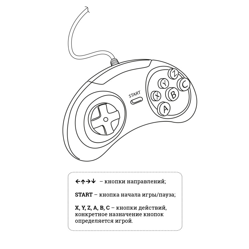 Быстрое подключение, не требует дополнительных настроек, включай и играй! Игровая приставка, кабель для подключения, блок питания — просто соедините все комплектующие, подключите к телевизору и электрической сети и включите приставку, можно начинать большое путешествие в мир увлекательных игр 16-бит.