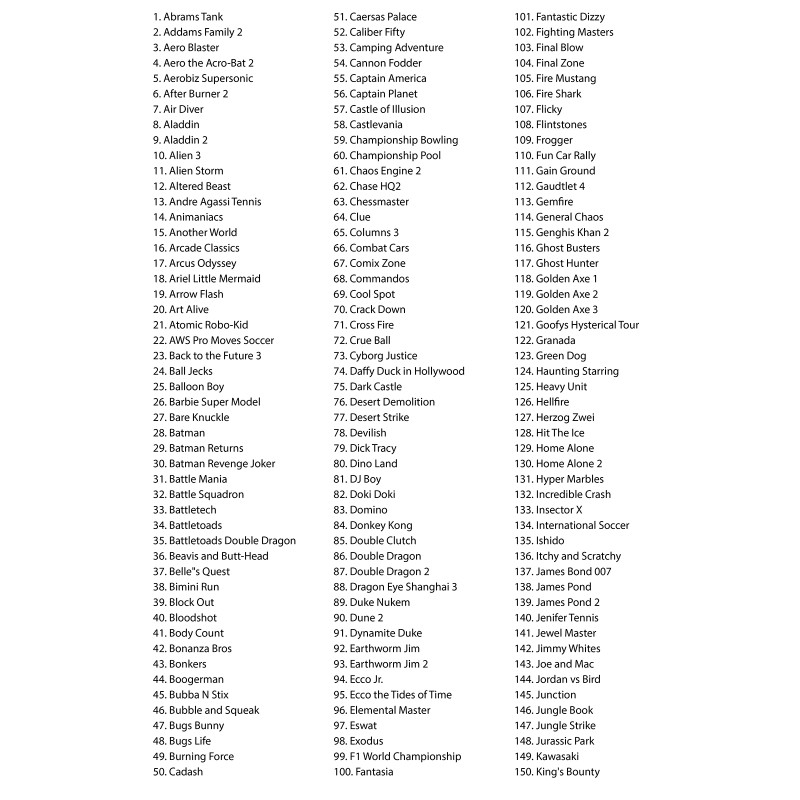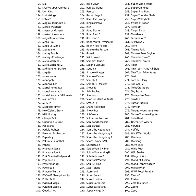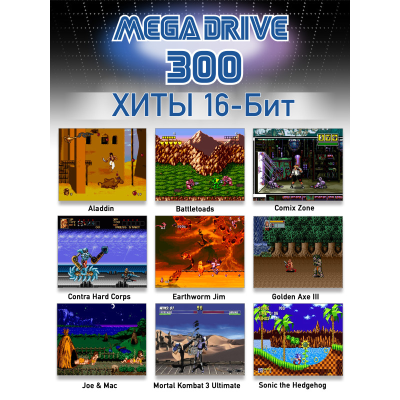 Mega Drive Lit 300 поддерживает картриджи формата 16 бит, что позволяет вам наслаждаться всеми любимыми классическими играми в оригинальном качестве. Погрузитесь в ностальгию и откройте для себя старые хиты или попробуйте те, которые у вас не было!