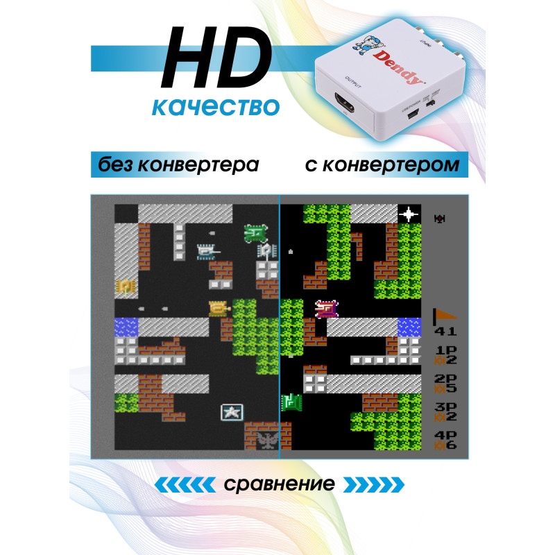 Данная версия приставки комплектуется HDMI конвертером, который позволяет подключать приставку к современным телевизорам, а также улучшает качество картинки.