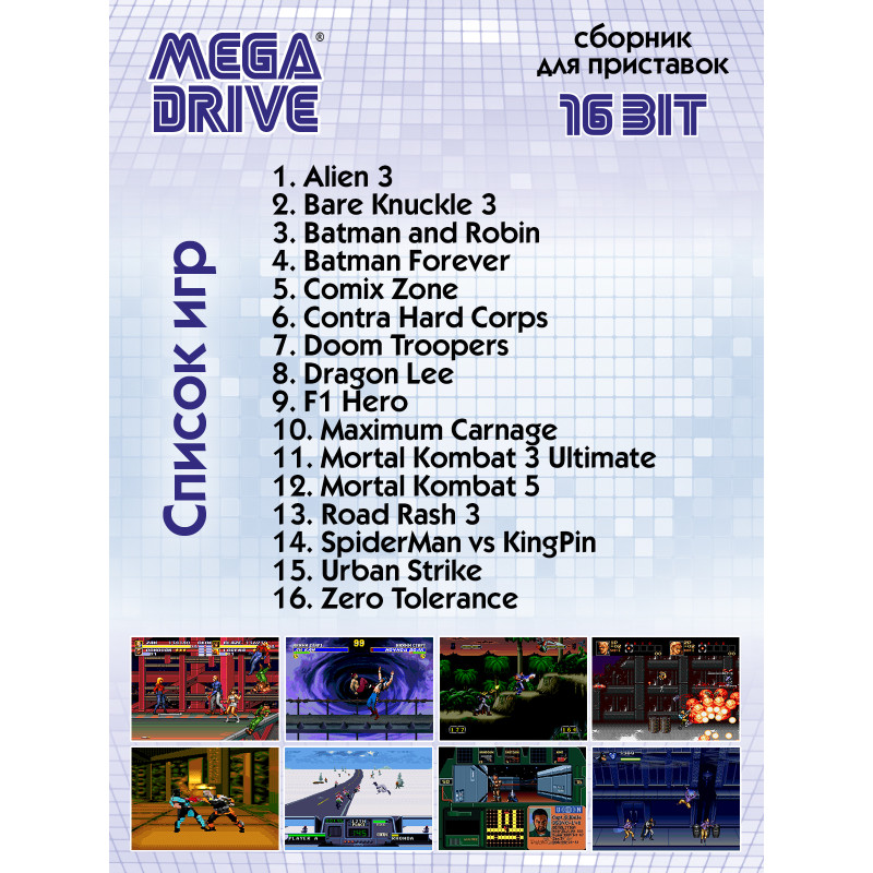Предлагаем вам отличный сборник на картридже с 16 играми для приставки Magistr Drive (в формате SEGA MEGA DRIVE 16bit)