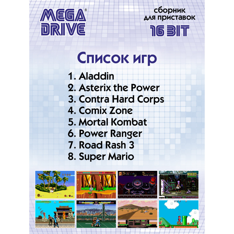 Такой знакомый, добрый и любимый мир из детства, 8 и 16 битных игр разместился на компактном картридже для игровой приставки в формате SEGA MEGA DRIVE 16bit. На нашем сборнике собрано 8 игр, которые позволят поностальгировать, а для кого-то может и заново открыть интересный мир игр из прошлого. Игры, написанные для 16 и 8 битных приставок, стали культовыми и остаются такими и по сей день. Управляете любимыми и легкоузнаваемыми, благодаря детальной 16 битной графике, персонажами из знаменитых фильмов и мультфильмов. Разгадайте все загадки, победите всех врагов, откройте все секретные уровни и просмотрите все финальные ролики на нашем сборнике. Все игры на картридже по-своему интересны и потребуют от вас предельного внимания и хорошей реакции! Почти во все игры на сборнике можно играть как одному, так и вдвоём, что добавит игровому процессу ещё больше азарта. Если случиться так, что уровень никак не хочет «поддаваться», то на нашем сайте, в игровом разделе, всегда можно «подглядеть» и миссия станет выполнимой.