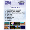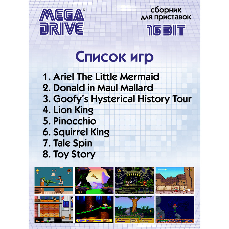 На этом сборнике собраны интересные и увлекательные игры для игровой приставки в формате SEGA 16 bit. Благодаря современным технологиям мы сумели разместить на картридже не одну, а целых 8 игр. Удивительный мир Sega Mega Drive с детально прорисованными, знакомыми вам персонажами из известных фильмов и мультфильмов не дадут вам заскучать! В начале 90х свершился серьёзный прорыв в мире игровых приставок. На смену 8 битным приставкам с огромным отрывом вышла на первое место знаменитая и любимая по сей день консоль – СЕГА МЕГА ДРАЙВ, с совершенно новым игровым контентом и богатым функционалом. Мы постарались, для тех, кто ещё не знаком с чудесным аркадным SEGA-миром и для его ярых поклонников, собрать на сборнике самые лучшие игры. Играйте сами, играйте с детьми и друзьями! На нашем сайте, в игровом разделе вы всегда найдёте подсказки и прохождения той или иной игры.