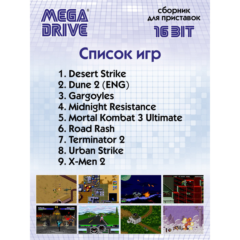 Готовы ли ваши пальцы к быстрым действиям, а как насчёт молниеносной реакции? Готовы? Тогда этот сборник именно для Вас! 9 игр, тщательно подобранных по тематике и интересным сюжетам, находятся на этом картридже. Благодаря созданию микрочипов представилась возможность создавать мульти игровые сборники. Согласитесь, это очень приятно, когда на одном носителе целых 9 игр. С появлением приставки SEGA MEGA DRIVE 16bit в игровом мире произошёл настоящий переворот. Было создано множество игр с отличной 16 битной графикой и полифоническим музыкальным сопровождением, которые навсегда оставили свой нестираемый след в сердцах игроманов со всего света! Выбирайте игру и смело идите до конца! Подглядеть решение для сложных моментов в игре, всегда можно на нашем сайте в игровом разделе.