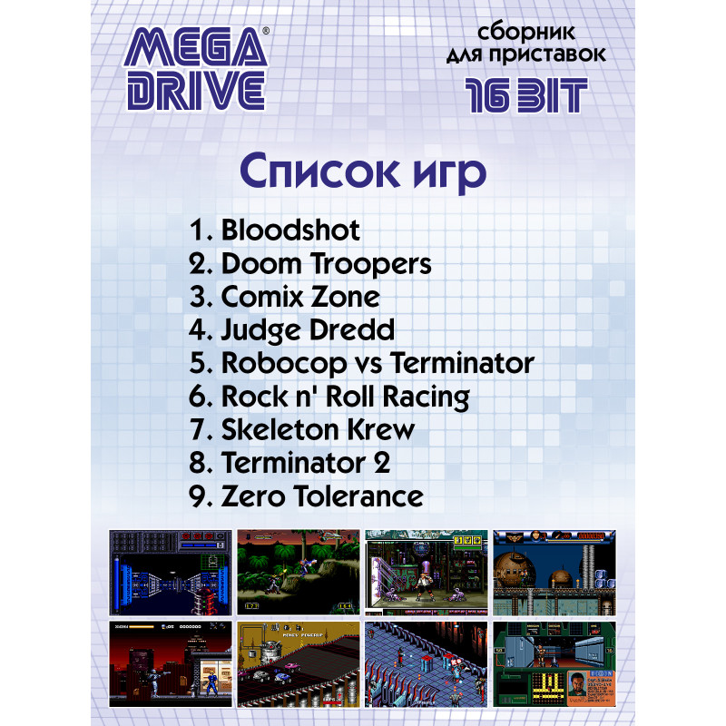 Такой знакомый, добрый и любимый мир из детства, 8 и 16 битных игр разместился на компактном картридже для игровой приставки в формате SEGA MEGA DRIVE 16bit. На нашем сборнике собрано 9 игр, которые позволят поностальгировать, а для кого-то может и заново открыть интересный мир игр из прошлого. Игры, написанные для 16 и 8 битных приставок, стали культовыми и остаются такими и по сей день. Управляете любимыми и легкоузнаваемыми, благодаря детальной 16 битной графике, персонажами из знаменитых фильмов и мультфильмов. Разгадайте все загадки, победите всех врагов, откройте все секретные уровни и просмотрите все финальные ролики на нашем сборнике. Все игры на картридже по-своему интересны и потребуют от вас предельного внимания и хорошей реакции! Почти во все игры на сборнике можно играть как одному, так и вдвоём, что добавит игровому процессу ещё больше азарта. Если случится так, что уровень никак не хочет «поддаваться», то на нашем сайте, в игровом разделе, всегда можно «подглядеть» и миссия станет выполнимой.