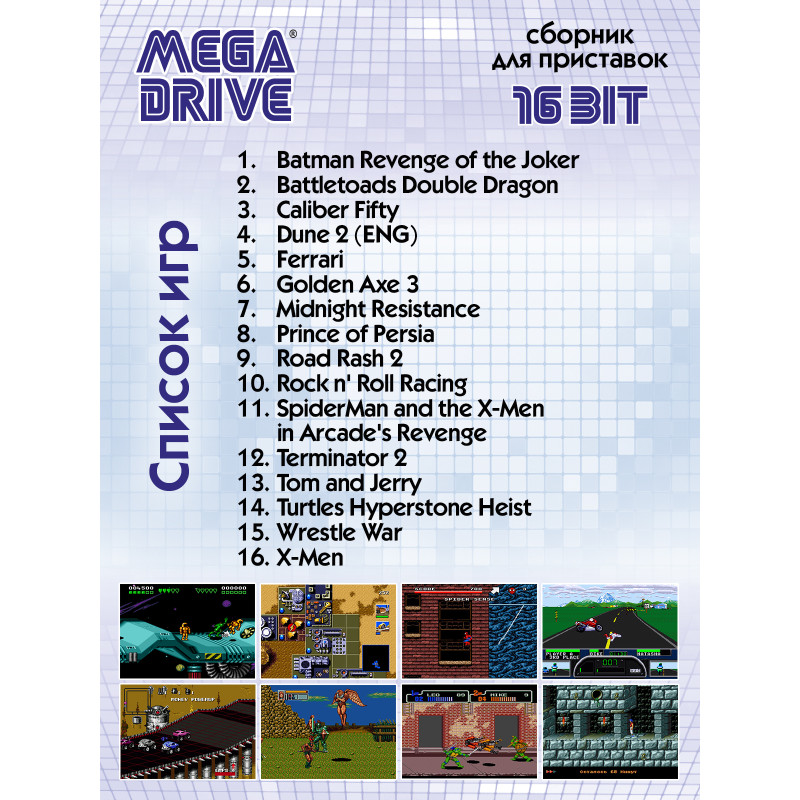 Такой знакомый, добрый и любимый мир из детства, 8 и 16 битных игр разместился на компактном картридже для игровой приставки в формате SEGA MEGA DRIVE 16bit. На нашем сборнике собрано 16 игр, которые позволят поностальгировать, а для кого-то может и заново открыть интересный мир игр из прошлого. Игры, написанные для 16 и 8 битных приставок, стали культовыми и остаются такими и по сей день. Управляете любимыми и легкоузнаваемыми, благодаря детальной 16 битной графике, персонажами из знаменитых фильмов и мультфильмов. Разгадайте все загадки, победите всех врагов, откройте все секретные уровни и просмотрите все финальные ролики на нашем сборнике. Все игры на картридже по-своему интересны и потребуют от вас предельного внимания и хорошей реакции! Почти во все игры на сборнике можно играть как одному, так и вдвоём, что добавит игровому процессу ещё больше азарта. Если случиться так, что уровень никак не хочет «поддаваться», то на нашем сайте, в игровом разделе, всегда можно «подглядеть» и миссия станет выполнимой.