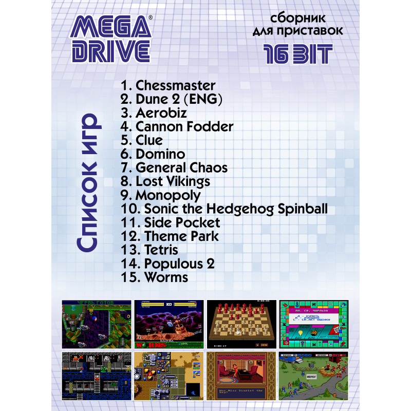 Предлагаем вашему вниманию очередной сборник, на компактном картридже, для игровой приставки в формате SEGA 16bit. Мы постарались включить в сборник состоящий из 15 игр, тщательно подобранных для самых искушённых любителей аркадных игр, только самое лучшее! Увлекательный и не примитивный игровой процесс, множество бонусных, секретных уровней и пасхалок. На нашем сайте вы без труда найдёте «игровой раздел» в котором есть подсказки, на случай, если вы «зависли» на каком-то уровне. С появлением на рынке игровой приставки СЕГА c 16, а не 8 битной графикой, в начале 90х свершился переворот в игровой индустрии и именитые создатели игр такие как: Дисней, Конами, Капком и многие другие - бросили все свои силы на создание игр для этой консоли. Самым приятным моментом стала возможность подключения двух джойстиков к приставке, что позволило сделать игровой процесс ещё более интересными. Играйте и выигрывайте, проверьте свою логику и реакцию в аркадном SEGA-мире!
