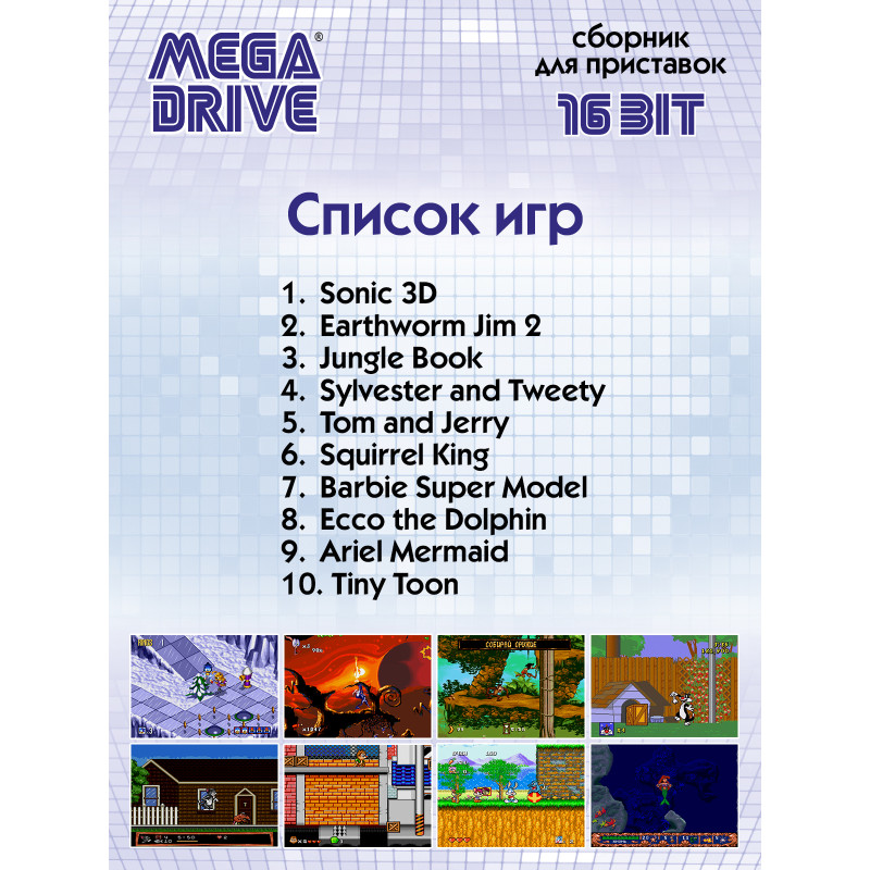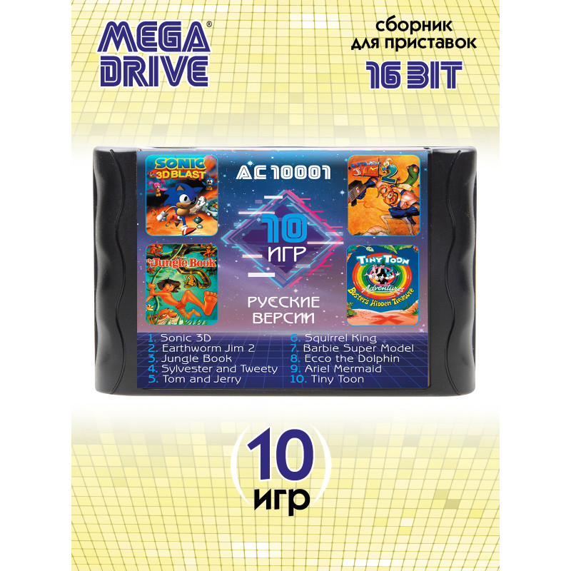 Такой знакомый, добрый и любимый мир из детства, 8 и 16 битных игр разместился на компактном картридже для игровой приставки в формате SEGA MEGA DRIVE 16bit. На нашем сборнике собрано 10 игр, которые позволят поностальгировать, а для кого-то может и заново открыть интересный мир игр из прошлого. Игры, написанные для 16 и 8 битных приставок, стали культовыми и остаются такими и по сей день. Управляете любимыми и легкоузнаваемыми, благодаря детальной 16 битной графике, персонажами из знаменитых фильмов и мультфильмов. Разгадайте все загадки, победите всех врагов, откройте все секретные уровни и просмотрите все финальные ролики на нашем сборнике. Все игры на картридже по-своему интересны и потребуют от вас предельного внимания и хорошей реакции! Почти во все игры на сборнике можно играть как одному, так и вдвоём, что добавит игровому процессу ещё больше азарта. Если случиться так, что уровень никак не хочет «поддаваться», то на нашем сайте, в игровом разделе, всегда можно «подглядеть» и миссия станет выполнимой.