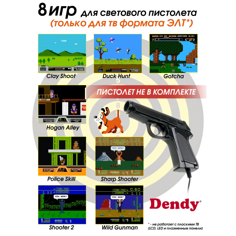 Dendy 300 поддерживает картриджи, позволяя вам расширить коллекцию и наслаждаться еще большим количеством игр. Однако учтите, что игровой пистолет работает только на ЭЛТ телевизорах.