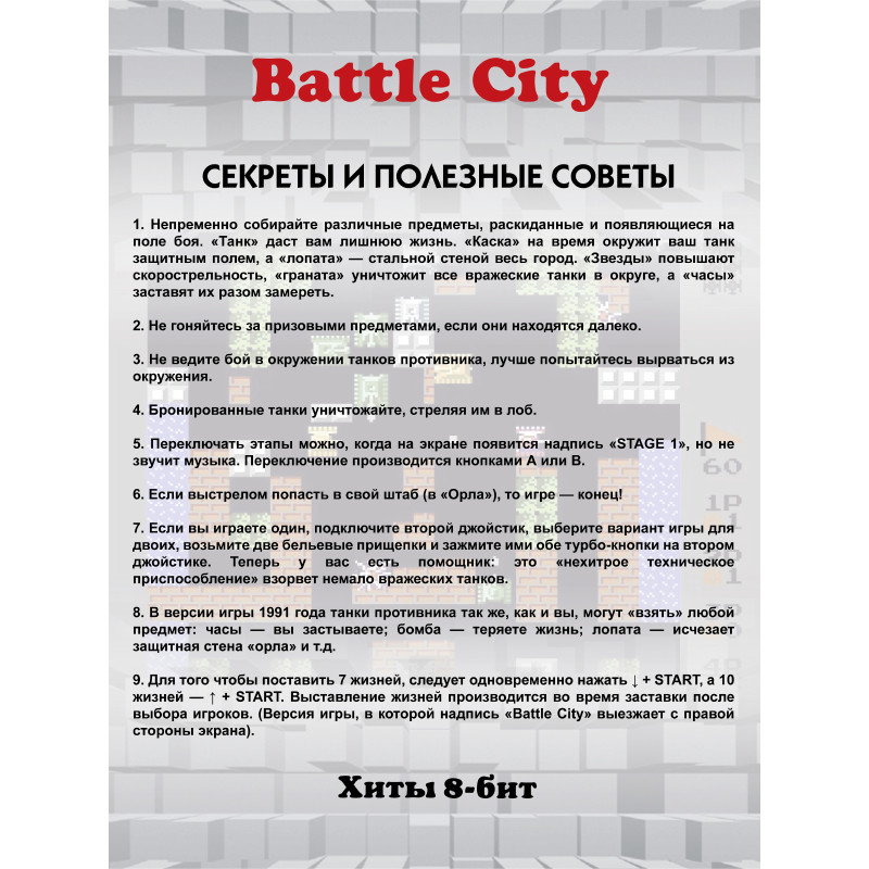 В сборник входят только полные версии, игры на одного и двух игроков. Игровой картридж совместим с игровыми видеоприставками 8-бит Денди (стандарт 8-bit) и аналогичными.