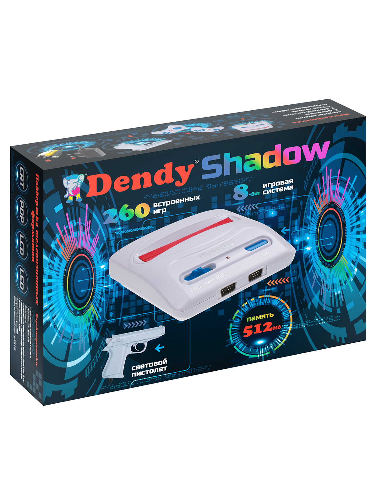 С ретроприставкой Dendy Shadow вы получаете доступ к коллекции из 260 игр, среди которых настоящие хиты эры 8-бит. В сборник включены 3 игры для светового пистолета работающих на современных ЖК и плазменных телевизорах!