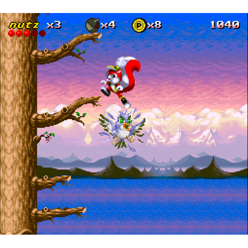 Наш герой выходит на улицу и начинает крутую разборку с помидорами-мутантами. Наиболее легкий способ мочить очередной помидор — запустить в него орех. Но не простой, а специальный, с заточкой. Когда такой орех попадает в помидор, то расчленяет его на две половинки, да так, что они разлетаются в разные стороны. Помидоры на пути — не единственная неприятность: в лес налетели гигантские пчелы (наверное, тоже мутанты), от них прямо житья нет. Еще по пути вам будут попадаться ежи. Прыгать на них нельзя (они же, ведь, колючие). Лучше всего сначала стянуть с них колючки с помощью мощного удара хвоста, или просто кинуть орехом. А потом делайте, что захотите. Можно двинуть ежу по чайнику или добить орехом. Однако, если увидите пень, знайте, что это добрый знак. Если запрыгнуть в него, то вы попадете в бонус-уровень. В бонусе можно найти кучу призов: десятки монет, жизненную энергию, а также самое главное оружие в игре — орехи. Пока вы промучаетесь, проходя два подуровня, в лесу наступит ночь, которая принесет новых гадов. Это пауки, бегающие по своей паутине. Их лучше всего приканчивать сразу, когда они спускаются вниз. Еще пара подуровней приведет вас к боссу — Мистеру Пауку. Станьте в левый угол экрана и прыгайте ему на башку. А когда начнут спускаться пауки сверху, то закидайте их орехами.