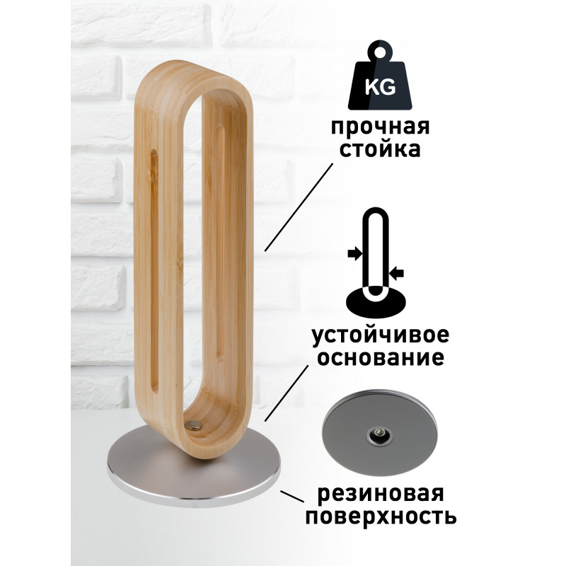 Каждый предмет на столе должен иметь свое место, и желательно, чтобы не страдала эстетическая сторона восприятия. Все ручки в подставке, бумаги в лоточке, а наушники на подставке. Строгий лаконичный дизайн, основание подставки утяжеленное и выполнено из алюминиевого сплава, сама подставка выполнена из бамбука в виде вытянутого овала, древесина хорошо обработана, затонирована и покрыта лаком. Особенно актуальна подставка для обладателей полноразмерных наушников, удобно размещается в любом месте, на столе, на полке или тумбочке, позволяет избегать перегиба проводов.